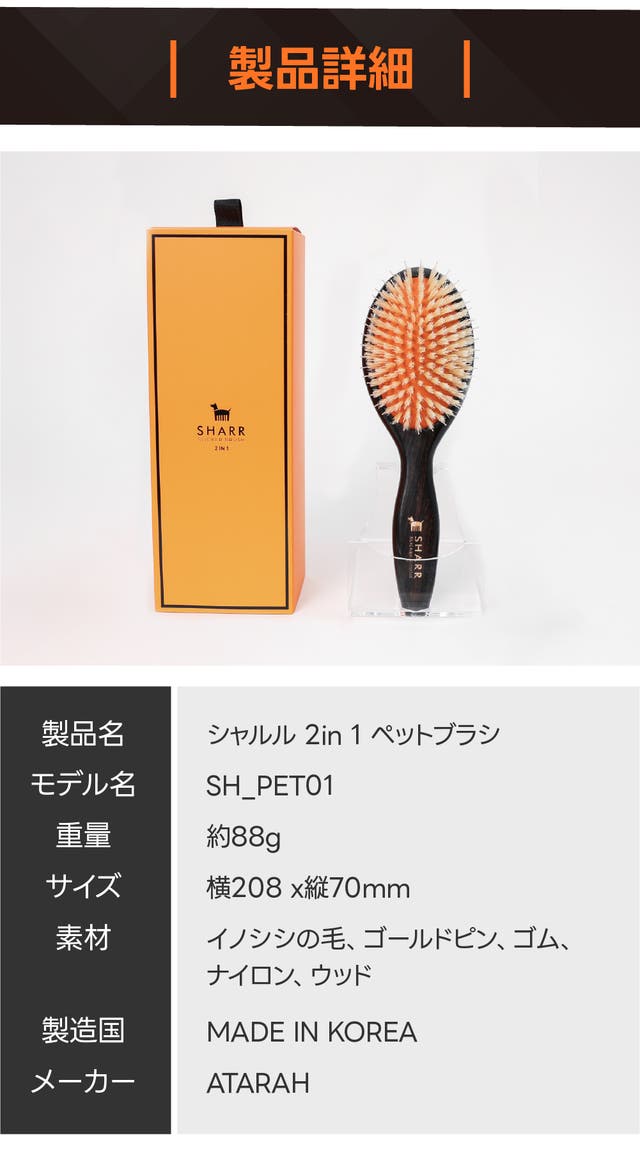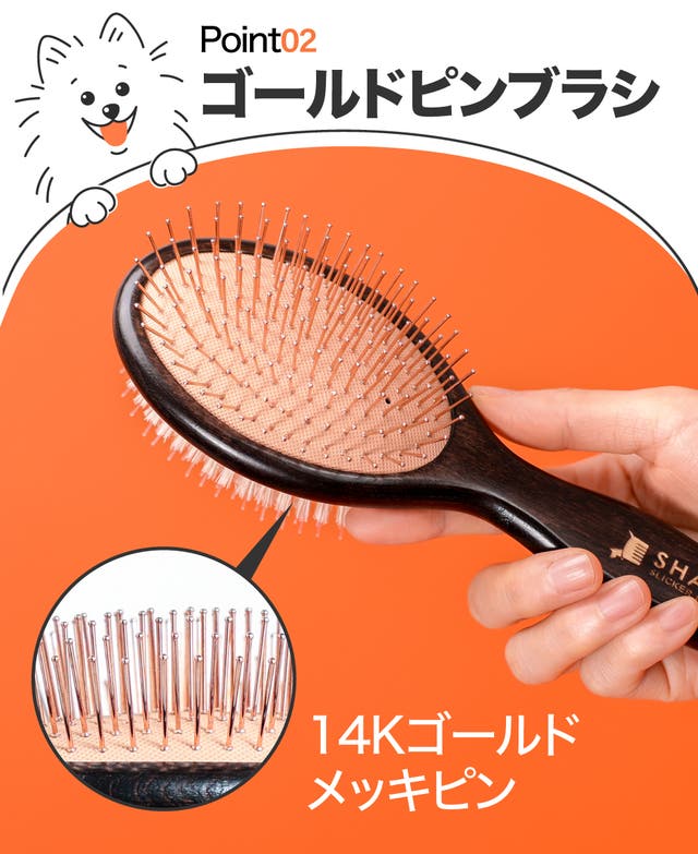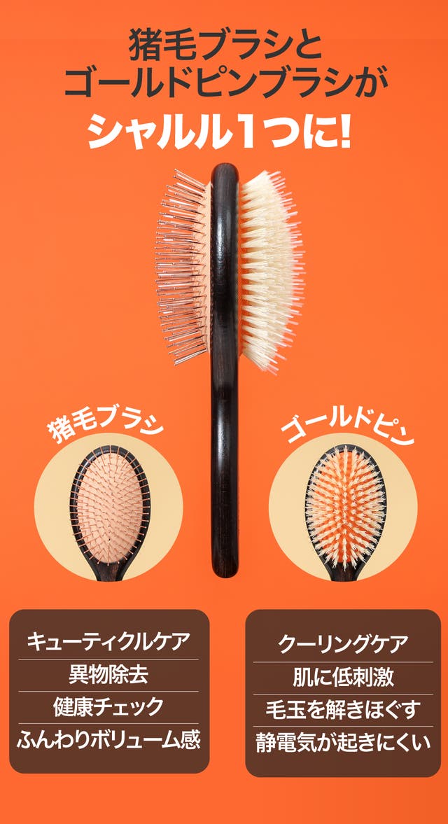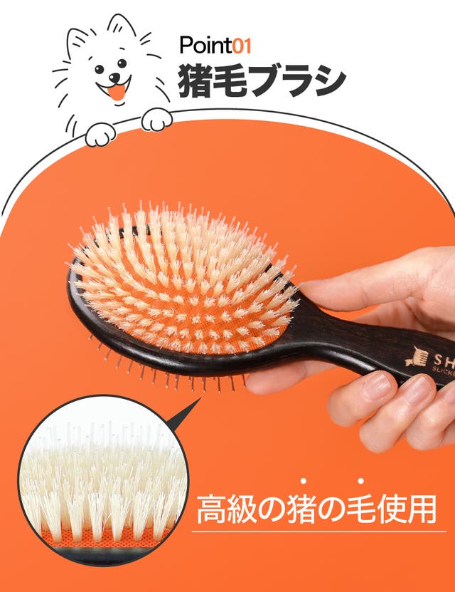 ペットの毛並と逆方向にブラッシングすると、猪毛の摩擦力で毛のボリュームを豊かにし、正方向にやさしくブラッシングするともつれ毛を楽に整えます。