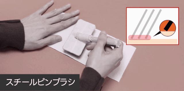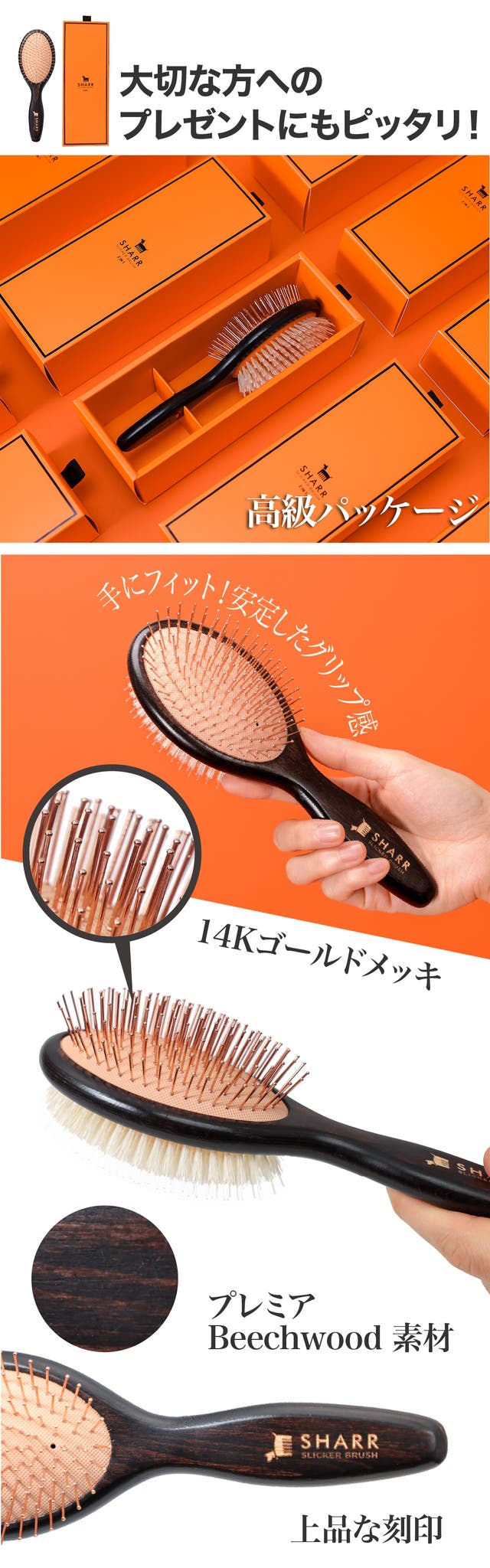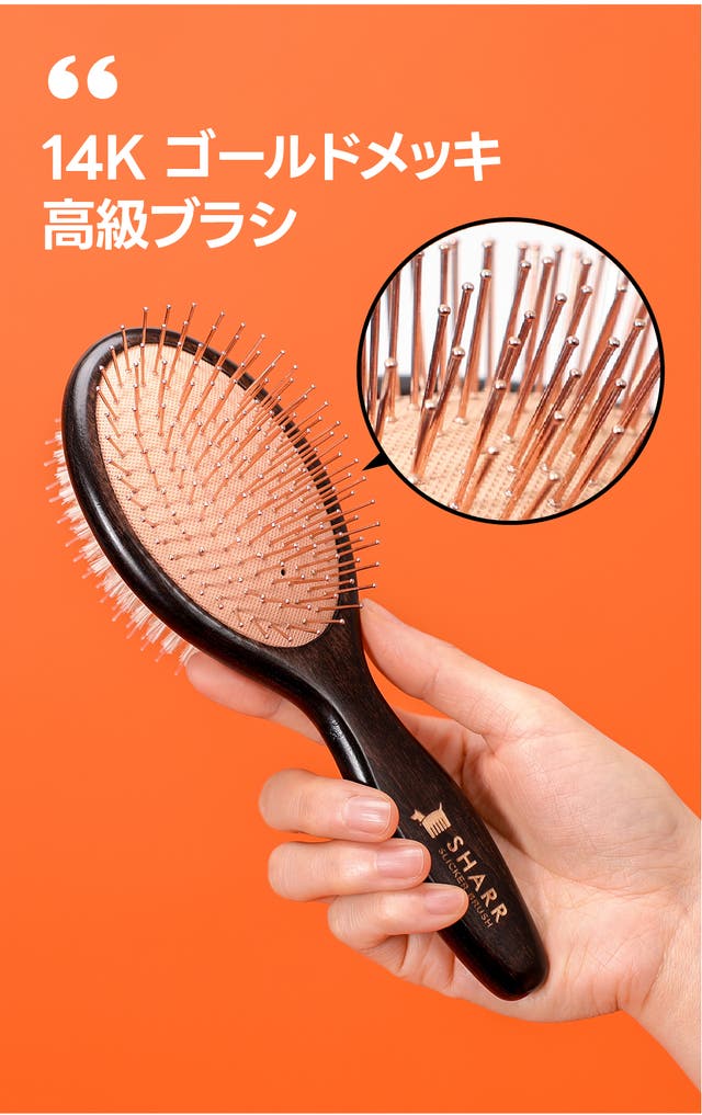 シャルルブラシはゴールドピンの先端に小さな丸いボールを加工して摩擦を減らし、 肌への刺激を最小限に抑えます。