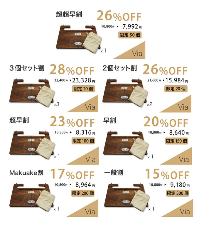 本文中に掲載させていただいたスケジュールは、あくまでプロジェクト公開時点の予定です。応援購入の性質上、配送遅延のおそれがございます。原則として、配送遅延に伴う応援購入のキャンセルはできませんが、リターン配送予定月から3カ月を超えた場合には、希望者に限りキャンセルにて対応させていただきます。商品の初期不良、またはお届けした商品がご注文内容と異なる場合、到着後14日以内にプロジェクトページの「実行者にメッセージ」よりご連絡下さい。状況を確認の上、返金対応、または良品との交換対応をさせていただきます。 一部国内に類似品が出回っている可能性がございます。 弊社では他社の類似品に関してのお問い合わせには対応できませんので、ご了承ください。弊社商品のオリジナル性については、上記プロジェクトに関する情報をご覧ください。 木材を使用していますので一つ一つ違いがあります。掲載画像はあくまで参考となっております。節や虫食い等のピンホール、変色、シミなどが認められる場合がありますので予めご了承ください。メッセージでいただいたお問い合わせにつきまして、土日祝日等、ご回答までにお時間をいただく場合がございます。アクセス集中が発生し、お申し込みが殺到した場合、購入完了画面表示後に在庫切れキャンセルとなる場合がございます。あらかじめご了承下さい。