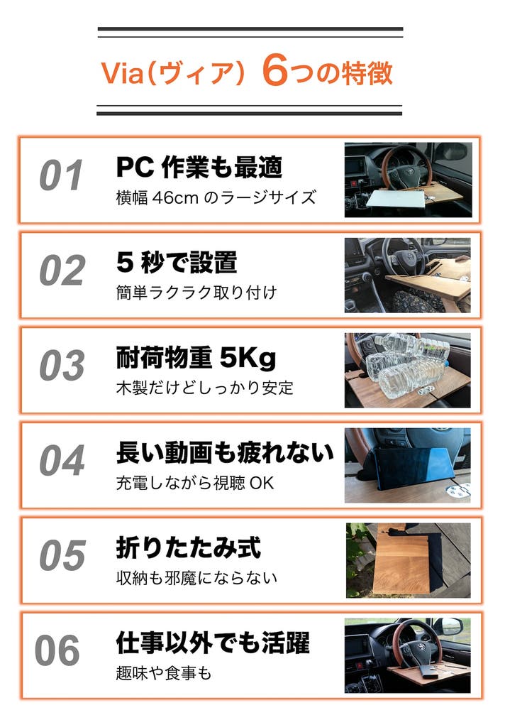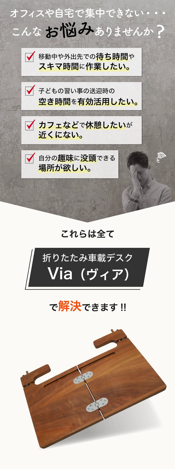 弊社のページをご覧いただきありがとうございます。「いつもの日常をより快適に」をモットーに新しい製品づくりに取り組んでいます。今回の「折りたたみ車載デスク:Via(ヴィア)」はいつもの車内をワンランク上、至高な空間でより快適にすごしていただきたいという思いで企画・開発しております。品質の高い製品を、いち早く皆様に体験して頂けるように日々活動しています。