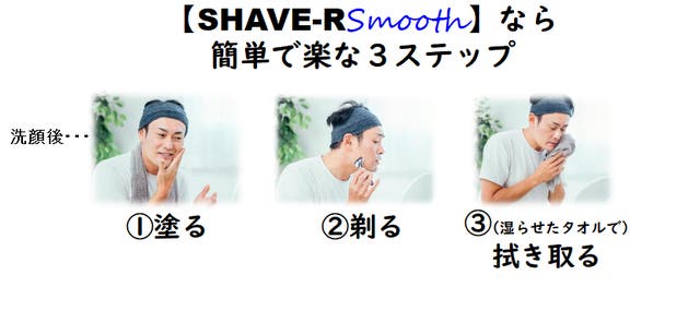 洗顔後、水気をタオルで拭き取り【SHAVE-R Smooth】を適量、顔全体に塗布する。べた付きも少なく伸びも良くサッパリとした使用感で肌をすこやかに保ちます