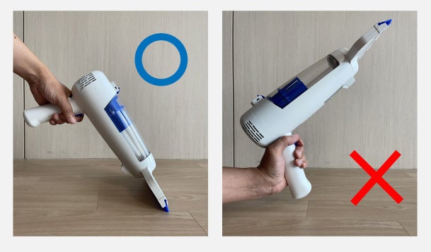 ・使用時には必ずクリーナーヘッドを下に向けて使用してください。クリーナーヘッドを上に向けると構造上液体が漏れる原因となります。