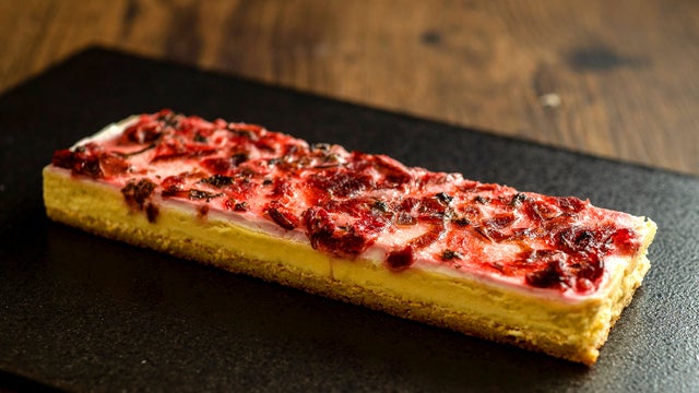 「生しば漬」は、フランボワーズとラズベリーのピューレに刻み入れて煮詰め、見た目も華やかなナパージュに。「生しば漬」の酸味と塩味が、ピューレの甘みとともに、濃厚なチーズの風味をより際立たせます。