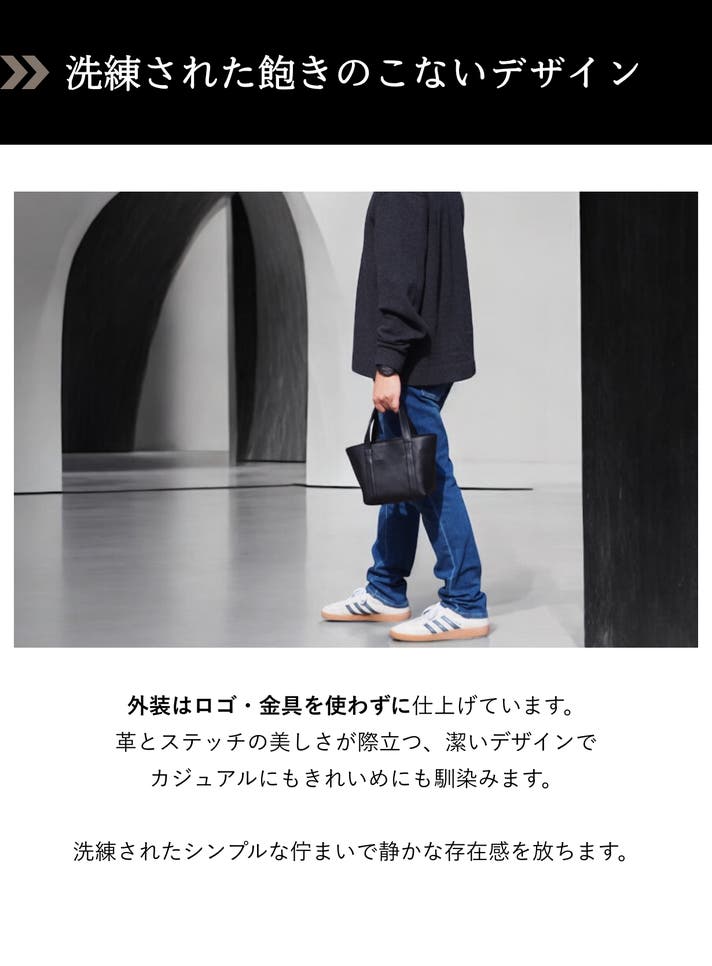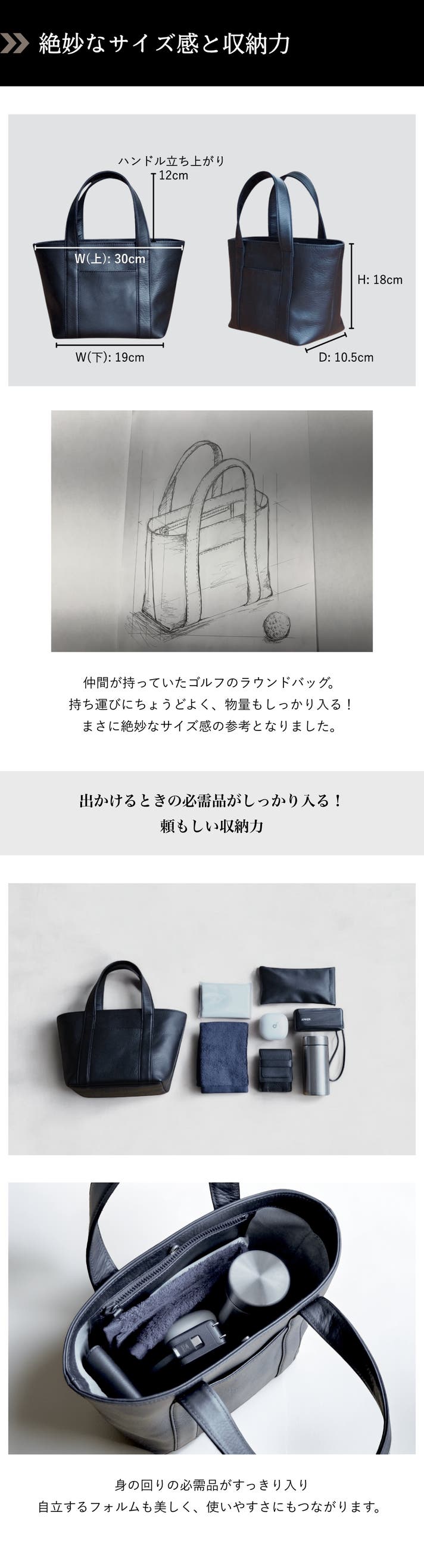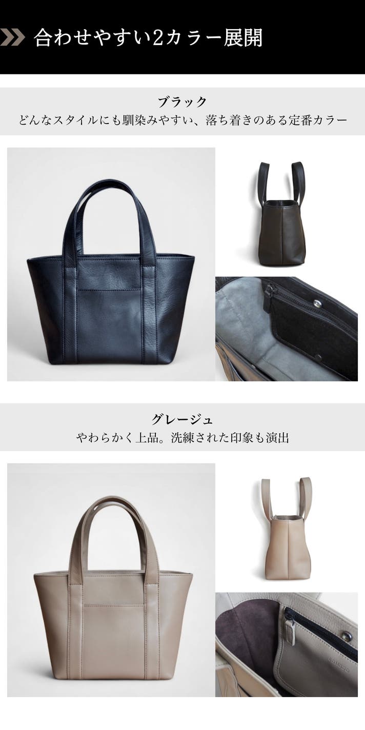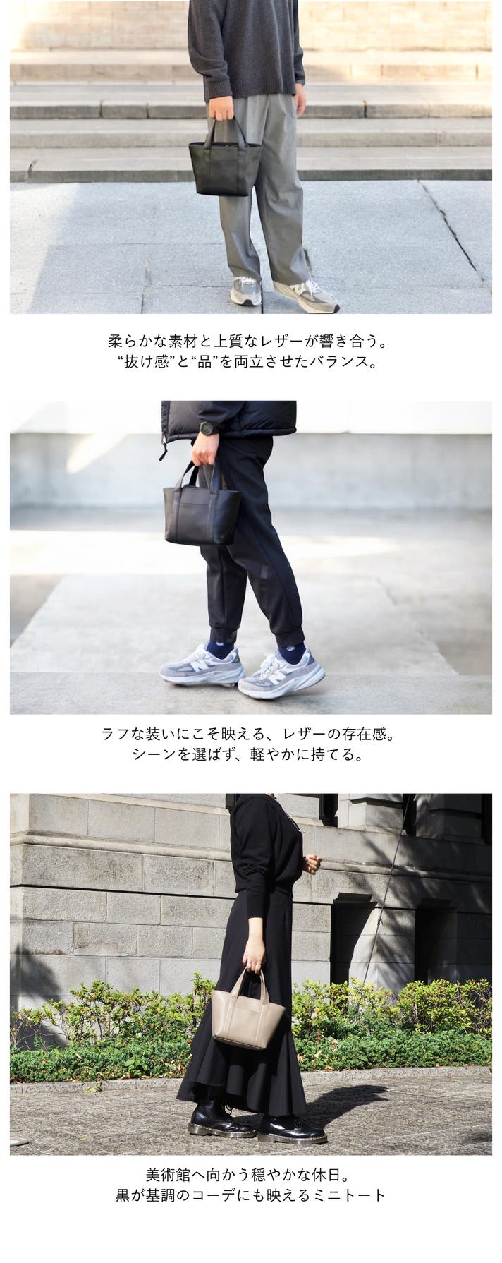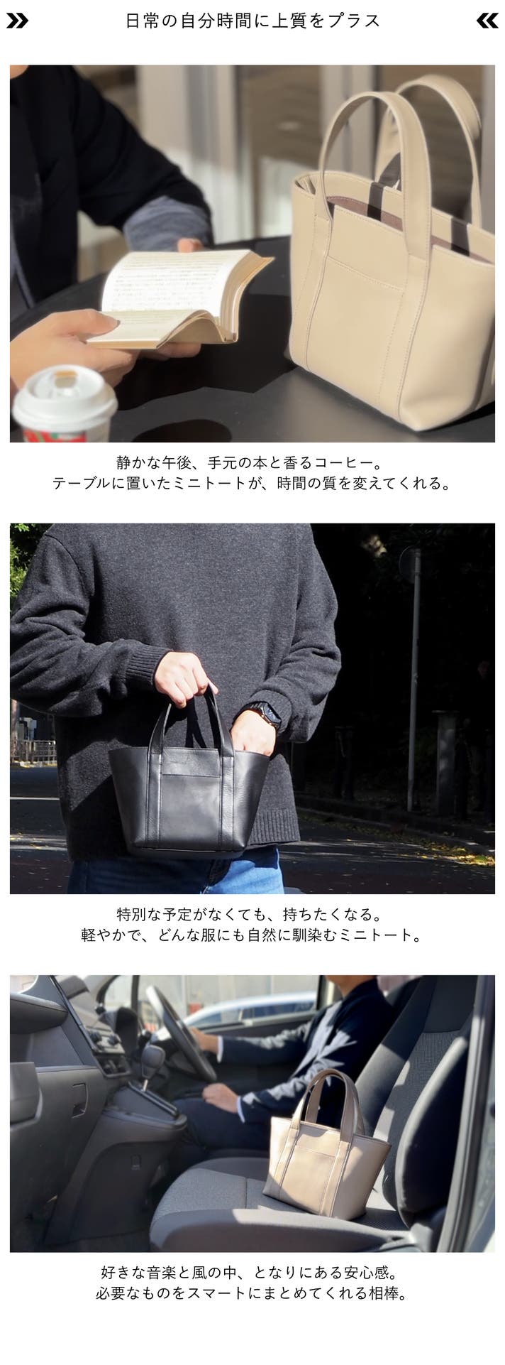 - 【機能】 シンプルな中に計算された設計。持つだけで装いが整う、大人のためのミニトート。