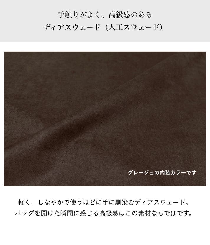 - 【素材】 上質レザーとスウェードを掛け合わせ、洗練された佇まいと軽やかな使いやすさを両立。
