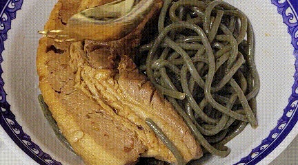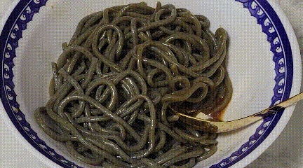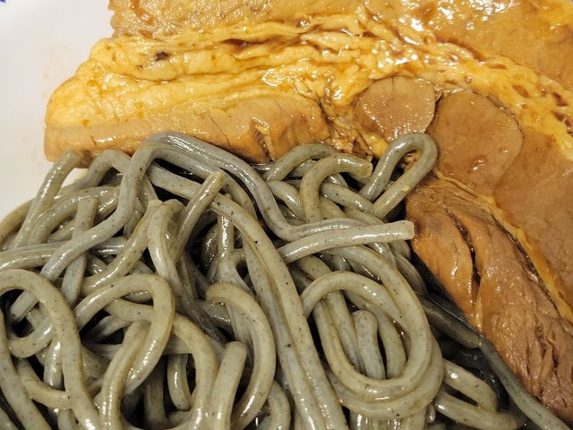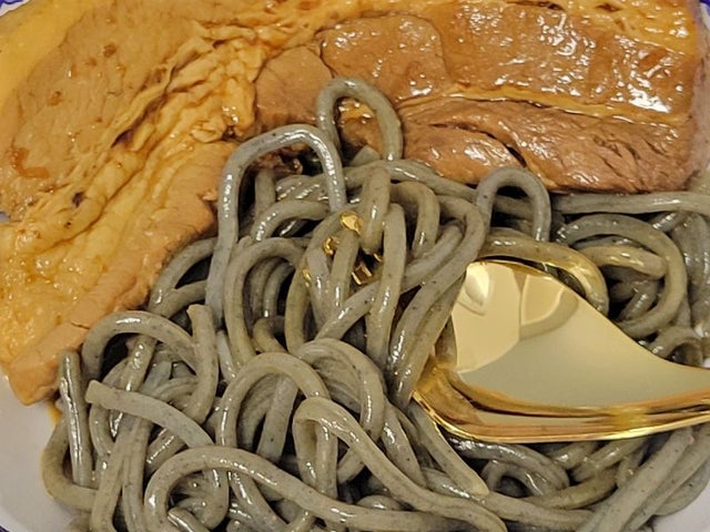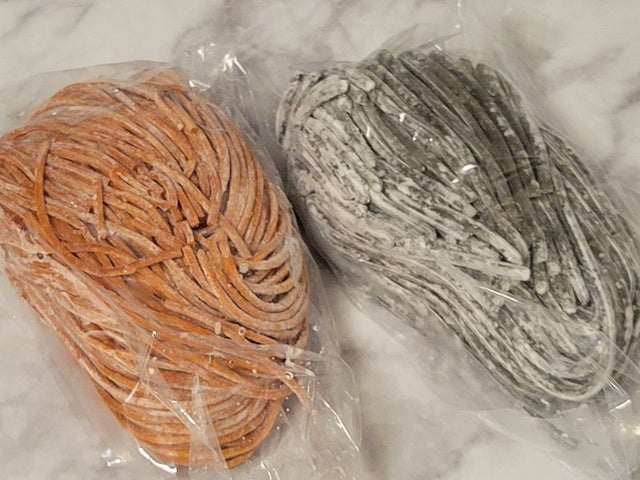 (右:漆黒麺/黒ゴマを練り込んでいます) (漆黒麺湯煎で4分程度)