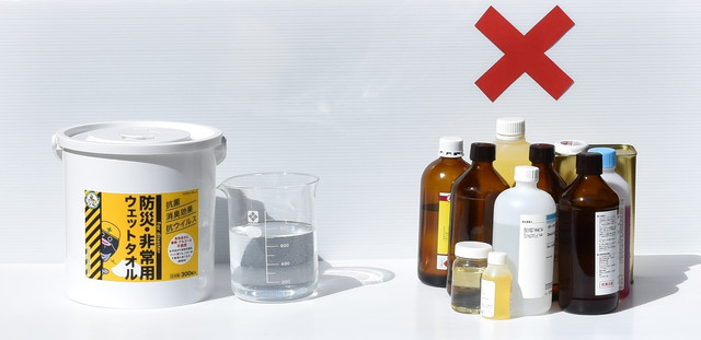 現在、広く出回っているノンアルコールのウエットタオルですが、除菌成分に使われるのは全て薬剤や化学溶剤です。これらの原液は大抵が毒劇物(だから菌が死ぬのですが)で、人体に本当に安全と言えるものではありません。除菌力が高いものは独特の臭いがし、肌荒れ、ベタつきを感じる人も少なくありません。