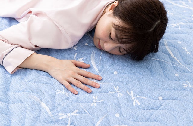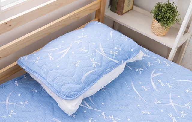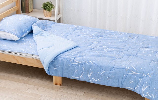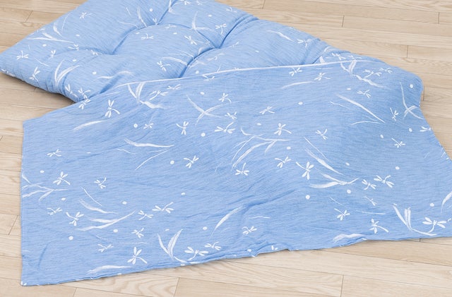 今回は肌に優しい綿100%(表生地)のしじら生地に、涼しげなトンボ柄をプリント。爽やかなデザインのしじら生地を使ったキルトケット、敷パット、枕パット、長座布団(長座布団カバー)、超ロング長座布団、シートクッションをご用意しました。