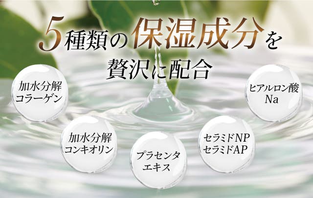 全成分 エタノール、(メタクリル酸エチルベタイン/アクリレーツ)コポリマー、水、BG、アクリレーツコポリマー、加水分解コラーゲン、セラミドNP、セラミドAP、プラセンタエキス、加水分解コンキオリン、ヒアルロン酸Na、パルミトイルトリペプチド-5、デュナリエラサリナエキス、プランクトンエキス、ネムノキ樹皮エキス、グリセリン、PEG-60水添ヒマシ油、カプリル酸グリセリル、グリチルリチン酸2K、ダルトシド、パンテノール、パントラクトン、クエン酸、ソルビン酸K、水酸化K、安息香酸Na、エチルヘキシルグリセリン、フェノキシエタノール
