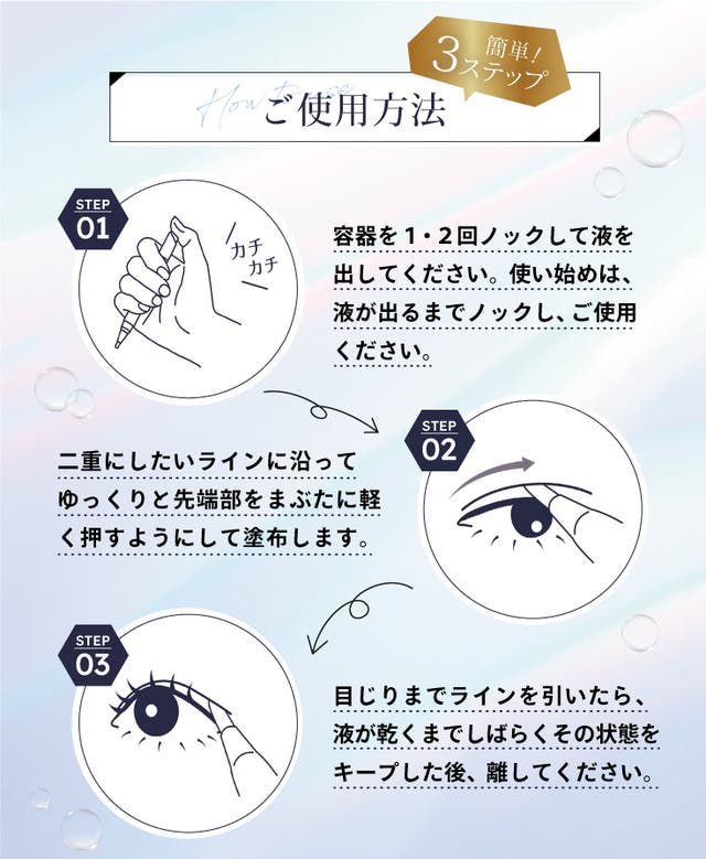 まぶたの皮膚は薄く刺激に弱いため、皮膜成分(接着作用)をアップしながら肌へのケアにこだわった5種類の保湿成分を贅沢に配合しました。
