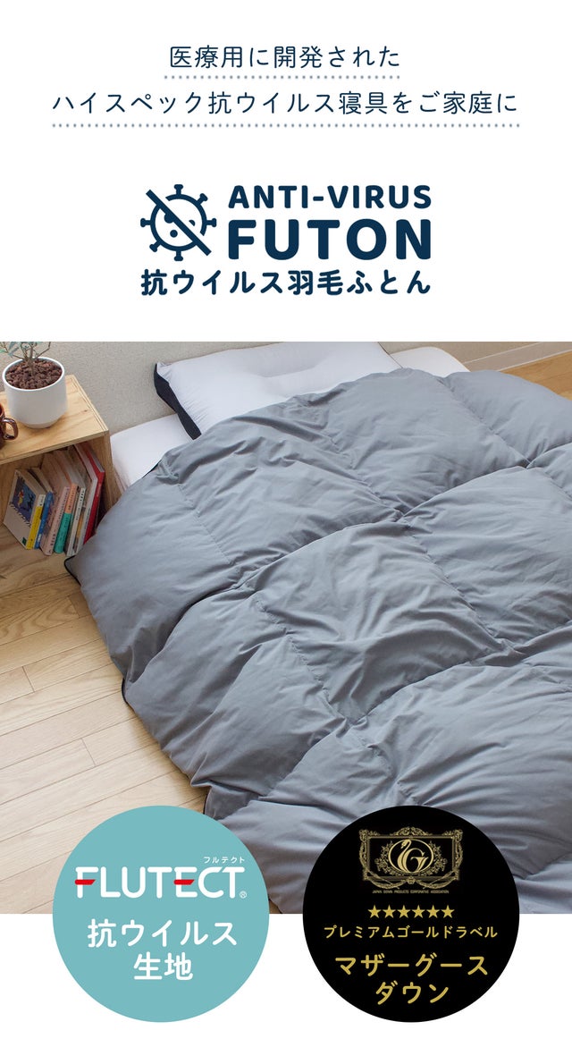 前回ご好評を頂いた抗ウイルス生地「フルテクト®」を使用した寝具シリーズ。医療用白衣やマスクなど衛生用品でも使用されている、繊維上の特定のウイルスを除去する効果のある素材を、今回は羽毛布団の側生地として使用しました。