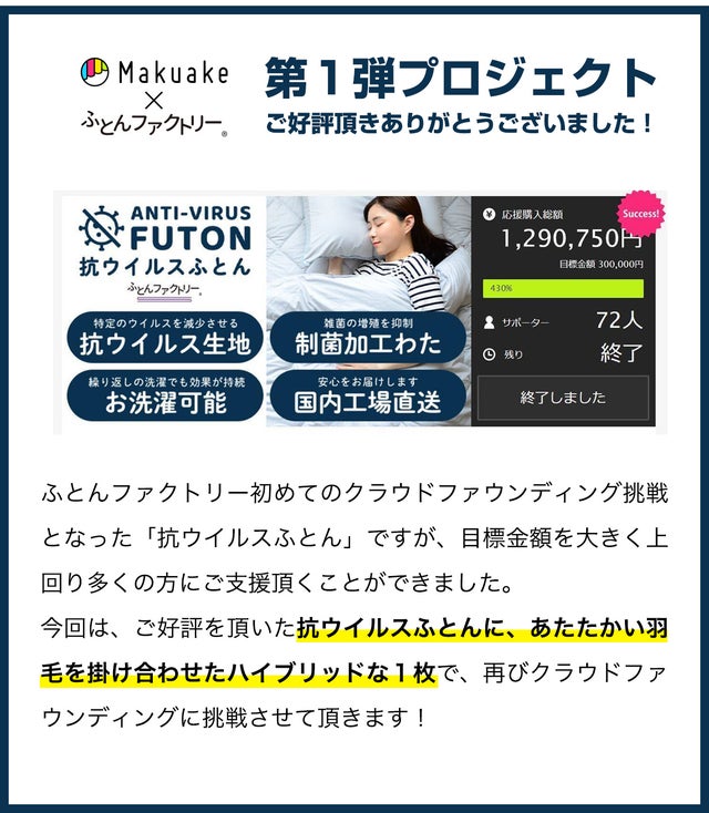 「Makuake(マクアケ)」は、実行者の想いを応援購入によって実現するアタラシイものやサービスのプラットフォームです。このページは、 スタートアップカテゴリの 「創業54年の老舗ふとんメーカーがおくる抗ウィルス羽毛ふとん」プロジェクト詳細ページです。