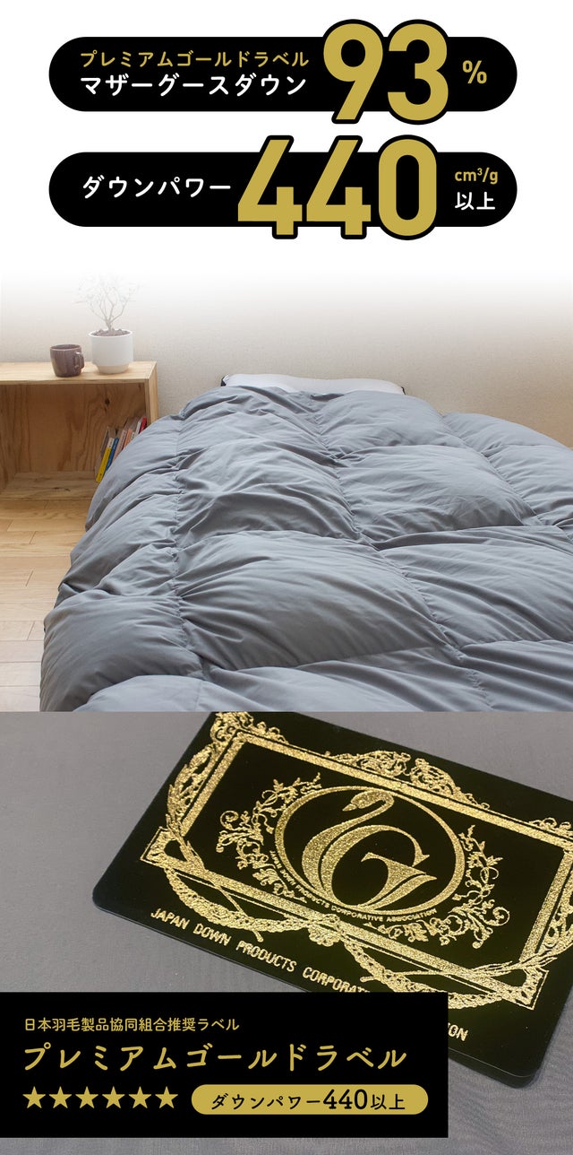 最上級のプレミアムゴールドはダウンパワー440cm3/g以上であることを証明しています。