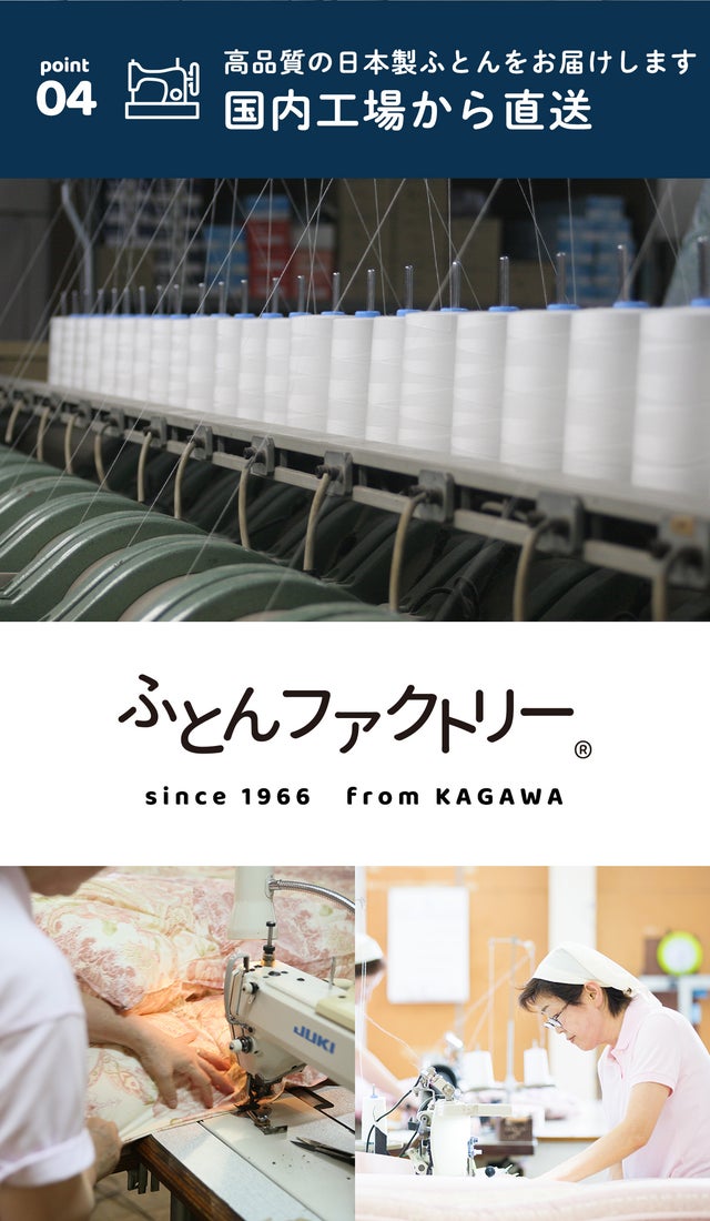 「ふとんファクトリー®」はそんなお客様の身体を常に考え"健康品質"をモットーにより良い商品を提供し続けています。多様化するお客様のご要望にお応えするため創造性に富んだグローバルな視野での発想を大切に考え、商品の企画から製造、物流に至るまでを一貫してプロデュースしています。質の高い眠りが健康な心身を育み、明日の元気につながるのです。