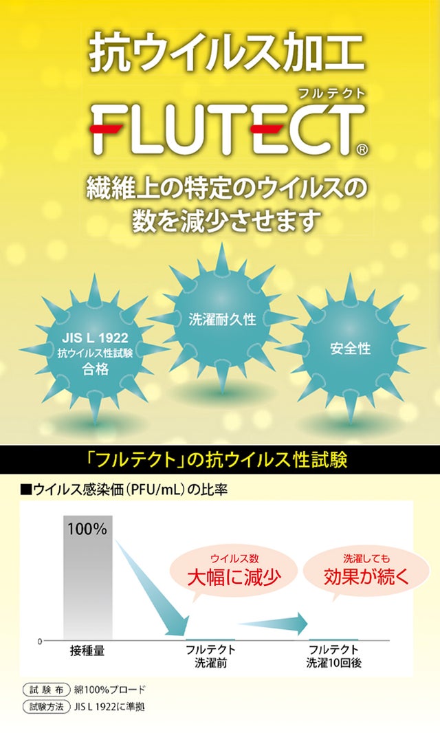※抗ウイルス加工は、病気の予防を目的とするものではありません。また、すべてのウイルスに効果があるわけではございません。