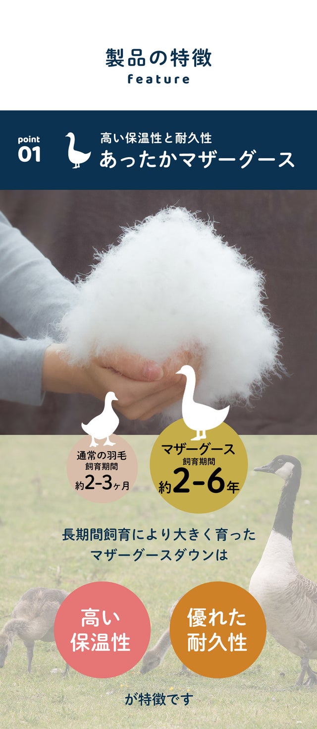 上質で保温性に優れたマザーグースダウンを93%を使用し最上級グレード「プレミアムゴールドラベル」の羽毛布団。マザーグースとは、2〜6年間と通常より長期間飼育された親鳥のことをいい、体格がよく健康的なグースが選ばれるため、ひとつひとつの羽毛の核が大きく、空気を多く含むため、保温性が高く耐久性にも優れているのが特徴です。そのため通常の羽毛布団より長い期間、高い品質を保つことができるのです。