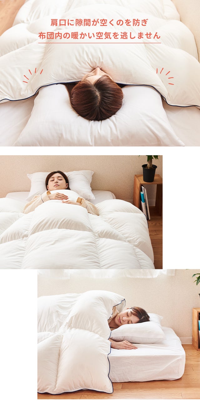 肩口や枕の部分に空いた隙間から冷気が入り込むのを防ぎ、体温で暖まった布団内の空気を逃さずに暖かさをキープします。