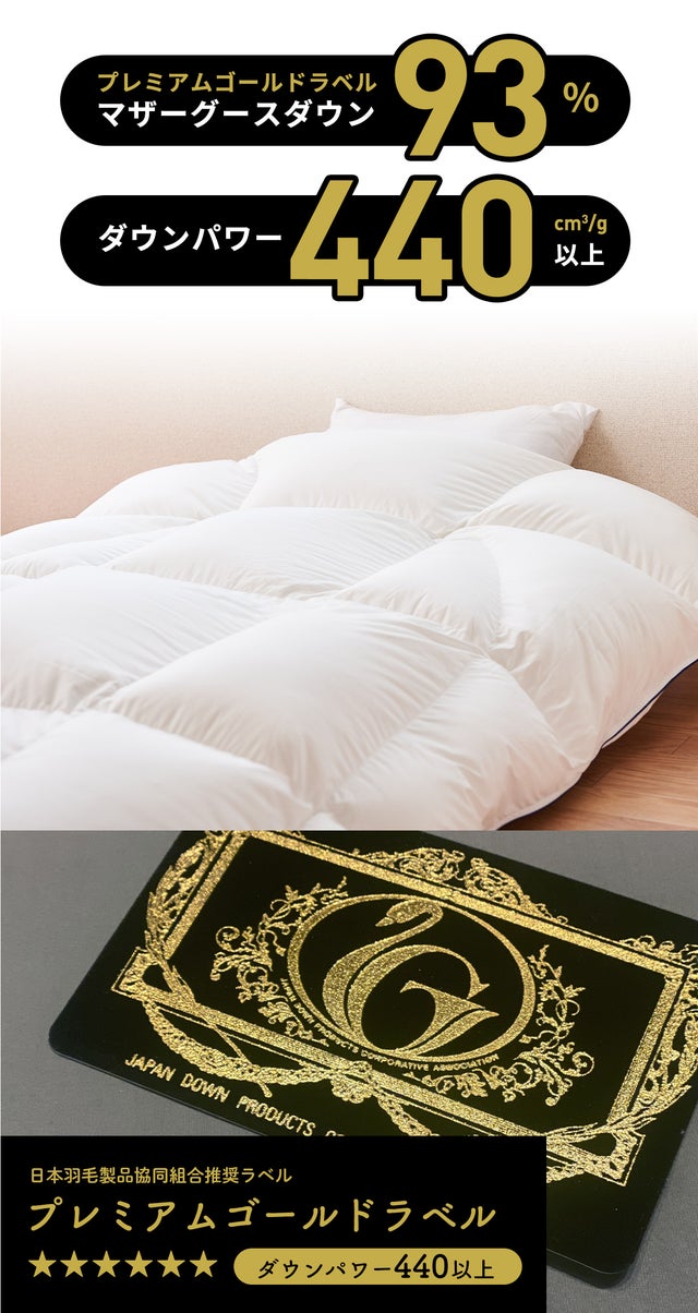 最上級のプレミアムゴールドはダウンパワー440cm3/g以上であることを証明しています。