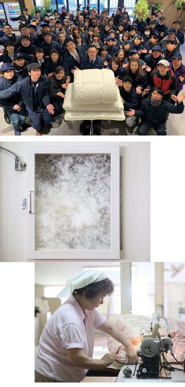 商品の企画から製造、物流に至るまでを一貫してプロデュースできることがふとんファクトリーの強み。製造工程では徹底した管理体制により、ひとつひとつ丁寧に、高品質な布団を生み出しています。