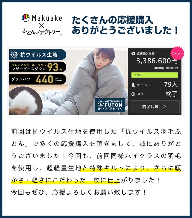 「Makuake(マクアケ)」は、実行者の想いを応援購入によって実現するアタラシイものやサービスのプラットフォームです。このページは、 スタートアップカテゴリの 「創業史上 最も軽く最も暖かい洗える羽毛布団 【Earthwrap】」プロジェクト詳細ページです。
