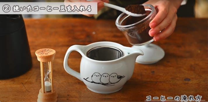 ふっくら丸い姿で人気の「雪の妖精シマエナガ」。その愛らしさを白磁の美しさで表現した有田焼ポットに、本格抽出ができるスーパーメッシュフィルターを組み合わせました。