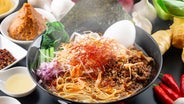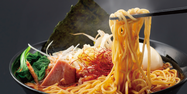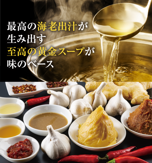 海老出汁の黄金スープをベースに北海道産赤味噌、白味噌、北海道醸造醤油をブレンドし、 練りゴマ、ネギオイル、花山椒と山椒のシビ辛、唐辛子、豆板醤、ニンニク、生姜など数多の食材で仕上げたこだわりのラーメンスープが誕生しました。