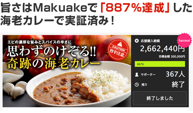 2020 年「奇跡の海老カレー」がマクアケにて800%越を達成