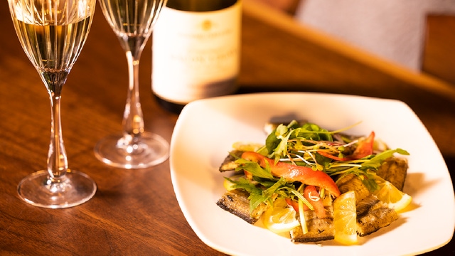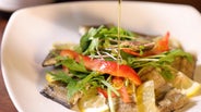 野菜とわら焼き塩うなぎを盛り付け、オリーブオイルをかければ、簡単なカルパッチョ風に。燻製のようなわら焼きの香りが白ワインにぴったりです。