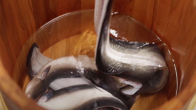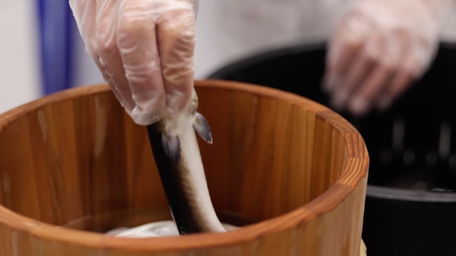 ①生のうなぎを、にがりいりの塩水に付け込みます。