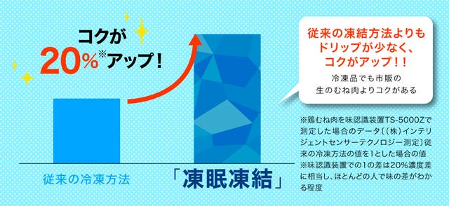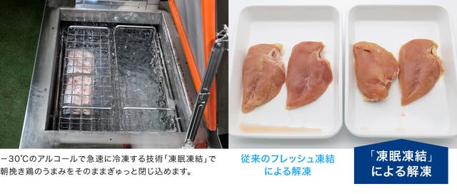鶏肉は朝締め・朝挽きがおいしいとされているように、何といっても鮮度が重要です。そのため、四万十鶏ふぁーむでは、約8時間熟成させた朝挽き鶏を真空パックにして、−30℃のアルコールで急速冷凍する「凍眠凍結」という冷凍技術を採用しています。通常の空冷式の急速冷凍では実現しえなかった冷凍技術で、チルドに限りなく近い味わいのまま出荷。旨味成分である「ドリップ」が従来の冷凍方法と比較し大幅に軽減できるため、鶏本来のおいしさをぎゅっと閉じ込めたままご家庭にお届けします。