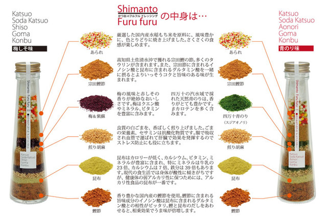 しまんとふるふるドレッシング。日本初!世界発!の鰹節や貴重な宗田鰹節の粉をベースに、昆布・煎り胡麻・ぶぶあられに青のりや梅しそが原材料の、すべて天然素材の、粉のドレッシングのことです。