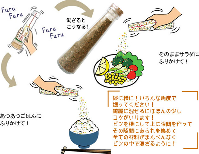 気になるその味は、2種類のフレーバーとも、かつお節と宗田かつお節がベースの、素材の味を生かした風味豊かなふりかけです。ほんの少し、海水から作った天日塩を入れてあり、程よい塩加減で素材そのものの味をより一層引き立てます。
