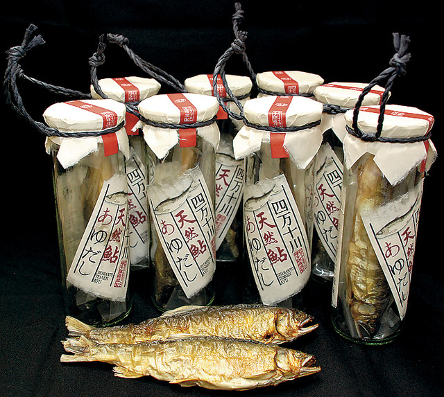 四万十川のコケをいっぱい食べて育った、香りの良い天然のあゆを、川漁師が炭火で丹念に焼き上げた焼鮎を、風味を逃さないようにパックして瓶の中に入れております。