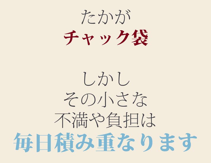 気になって周囲に聞いてみると、一般家庭でも普段から作り置きをしている方はもちろん、食べかけのお菓子、釣りなどの趣味、薬局で購入する薬など、様々なシーンでチャック袋を使い、また上手く閉まらない不満や負担を持った方が多いことがわかりました。