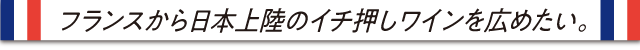 自社のみで輸入したフランスからの日本未入荷ワインを皆様に広めたく今回募集を行いました。弊社のワインラインナップは、ドメーヌとの度重なる打ち合わせを行い、仏ミシュラン1星のレストランで働いている友人のシェフソムリエからの評価、価格帯を総合的に判断して、日本の皆様に楽しく、たくさん飲んで頂けるように厳選しています。