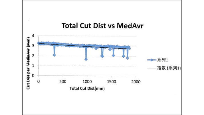 紙の束(400枚)を1回で何mm切れるかのテスト試験の結果、最初1回で深さ3.45mm、1000回目には2.75mm切ることが出来ました。
