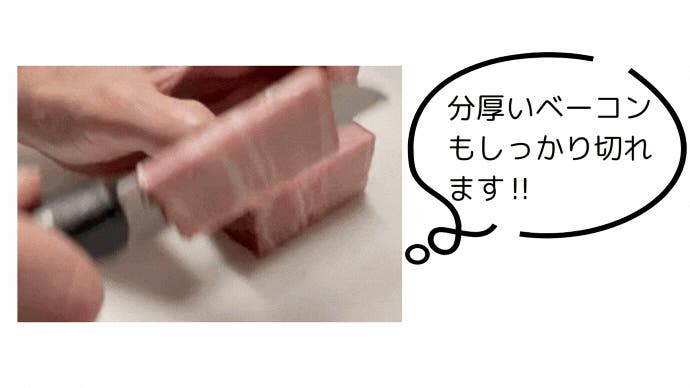 一般の包丁と比較して、軽量かつ刃が硬く強度もあるため、薄く加工が出来ます。