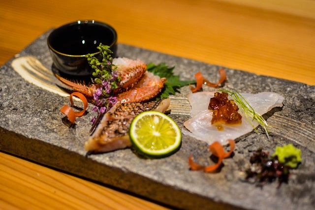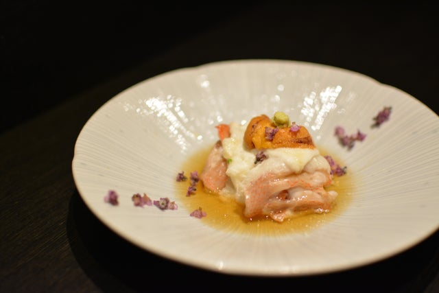 基本的にお醤油で食べるのが一般的な御造りですが、少しそれに飽きていたオーナーの要望で のどぐろ、活毛蟹などを使用しながら、ジュレや塩など、今までとは少し趣向を変えて御造りを提供した、オーナーも大満足の一皿です。