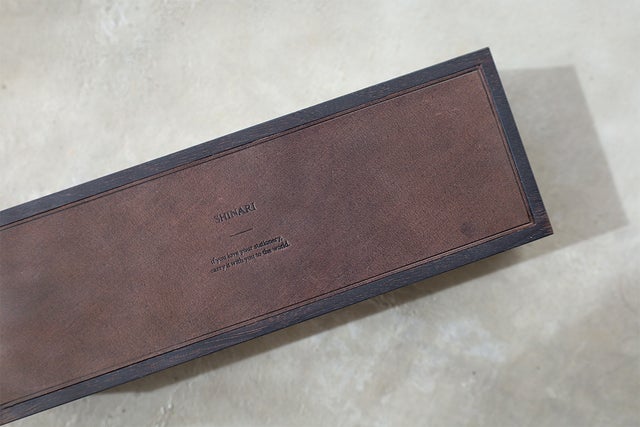 蓋の表にはめ込まれたレザーには、「旅するガラスペンケース」のためにデザインされたSHINARIの特別なロゴを刻印しています。