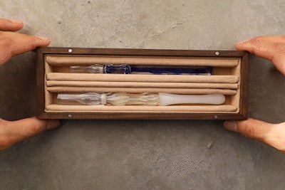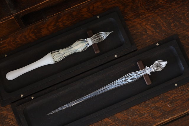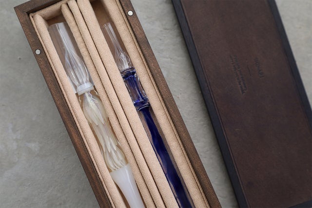 ガラスペンはニブはもちろん、軸に至るまで繊細な造作のものが多く、さらにガラスという素材の特性より、取り扱う際に特筆してハードルを感じていたのが、「持ち出す」ことでした。