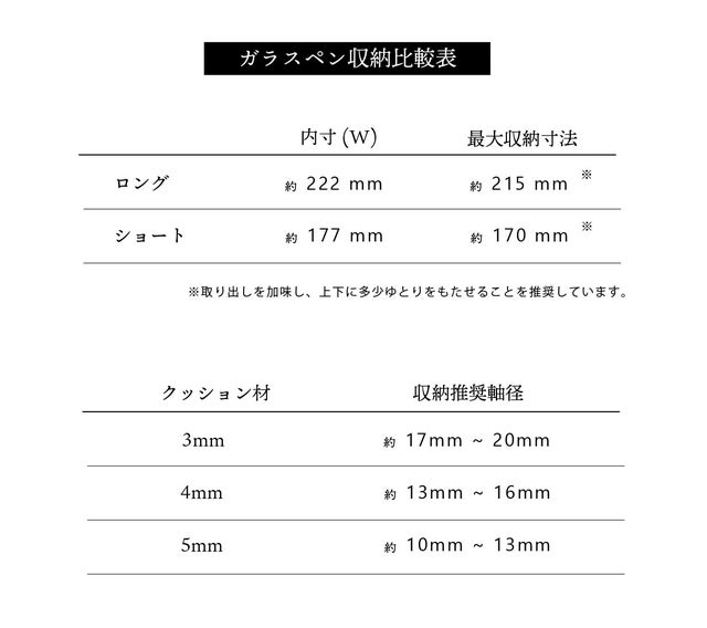 - しっかりと収納する為に、ガラスペンの軸の太さや長さに合わせて選べる複数通りの仕様。
