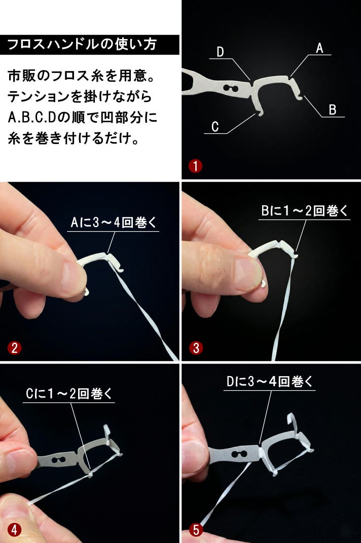 SHINARIは舌ケアだけではありません。くるっと裏返し、市販のフロス糸を巻くだけで、長期間使い続けられるフロスハンドルに変わります。 金属ハンドルが指先にダイレクトに情報を伝え、 歯茎を傷つけにくい、繊細な操作感を実現しました。