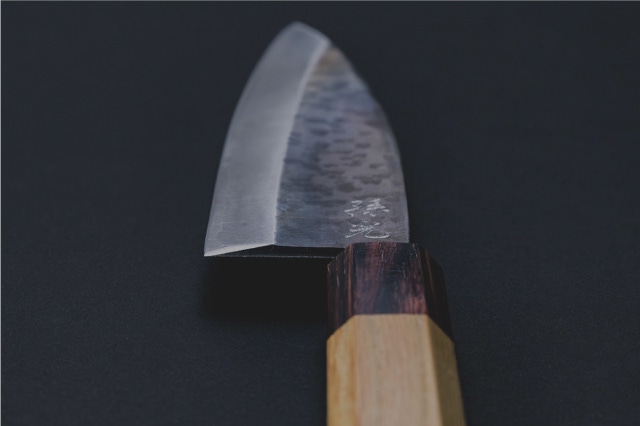 硬いステンレス鋼は骨などに当たると衝撃で刃こぼれしやすいのですが、粘りのある青紙2号は刃こぼれしにくいです。