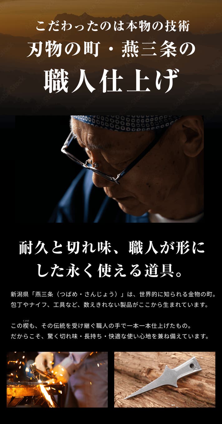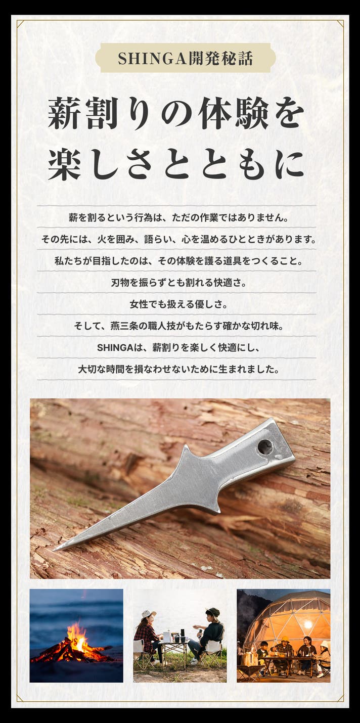 キャンプや庭先で薪割りをもっと「簡単に、楽しく」できるように、燕三条の匠と共に生み出しました。