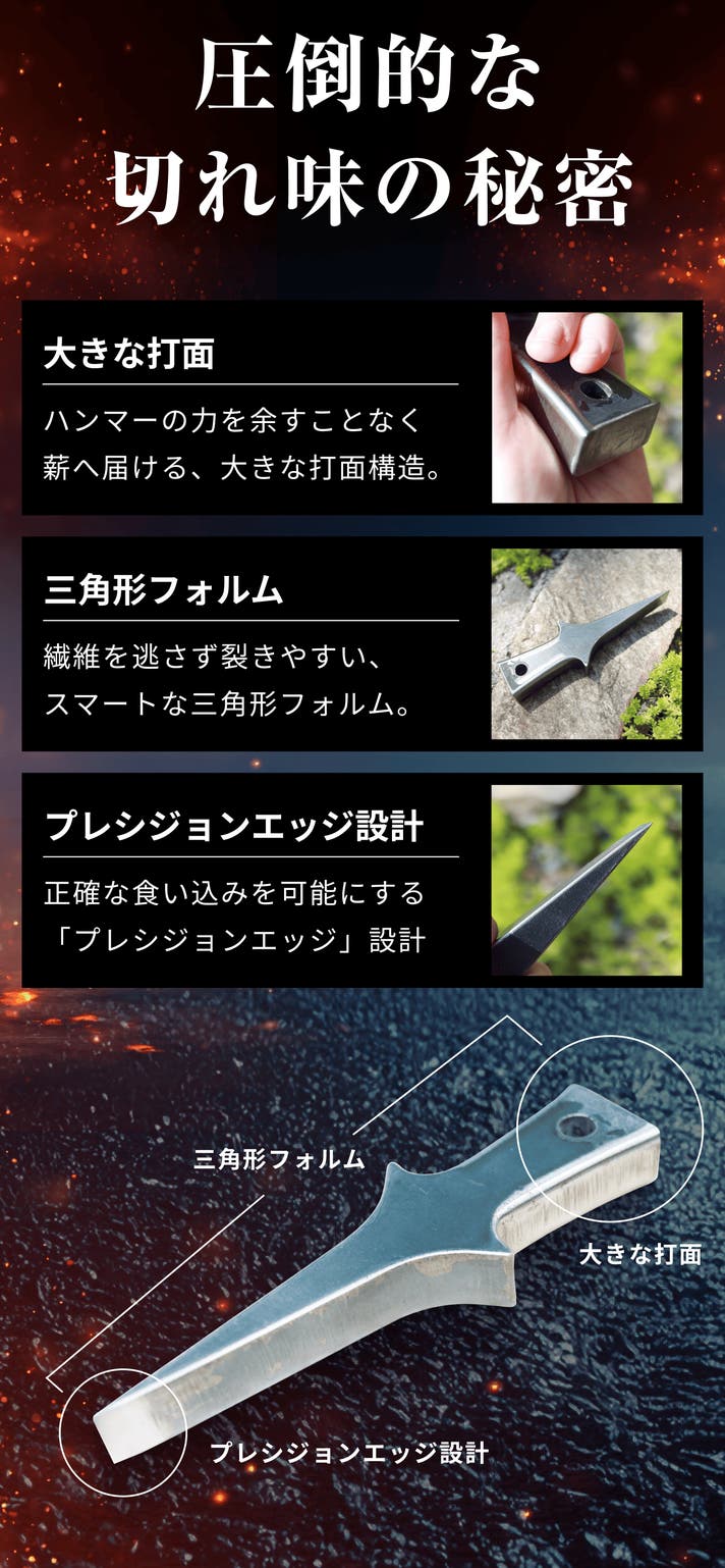 - 精密刃先・三角形設計・広打面で効率的に薪を割れる専用楔。