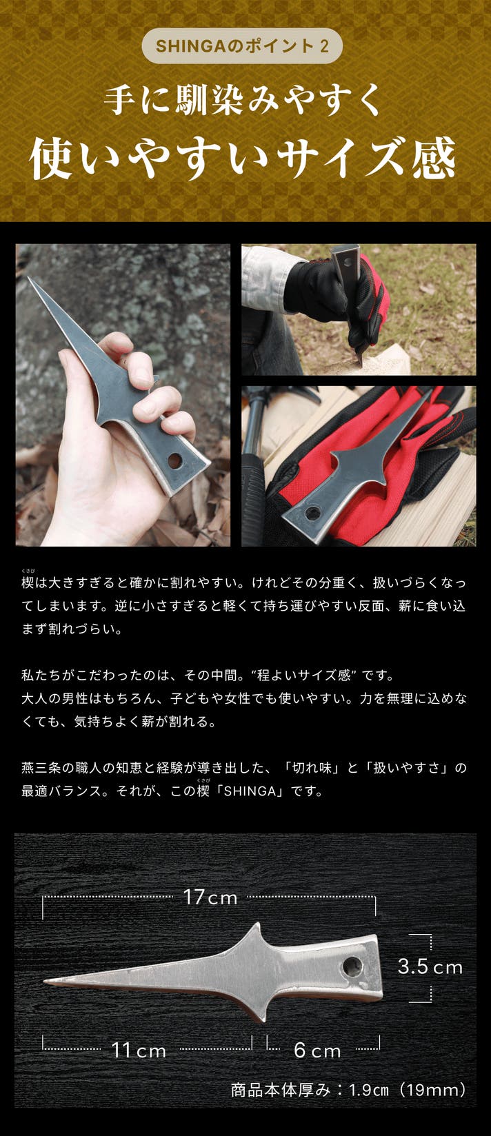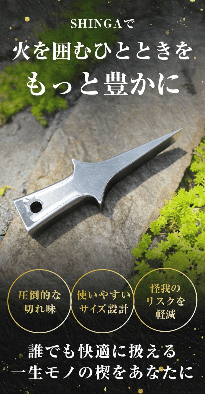 片手で扱える、小型薪割り用楔「SHINGA」。