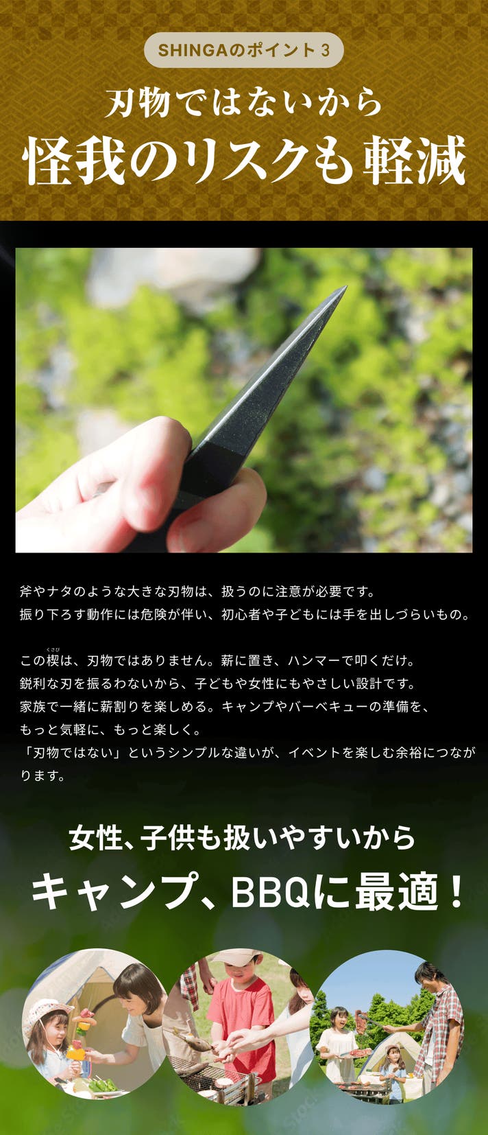 - 家族や初心者でも片手で扱え、手軽に薪割りを楽しめる楔。