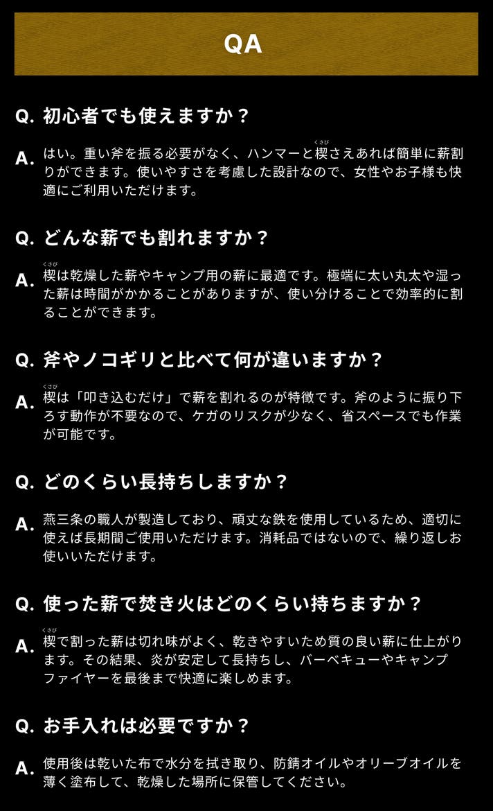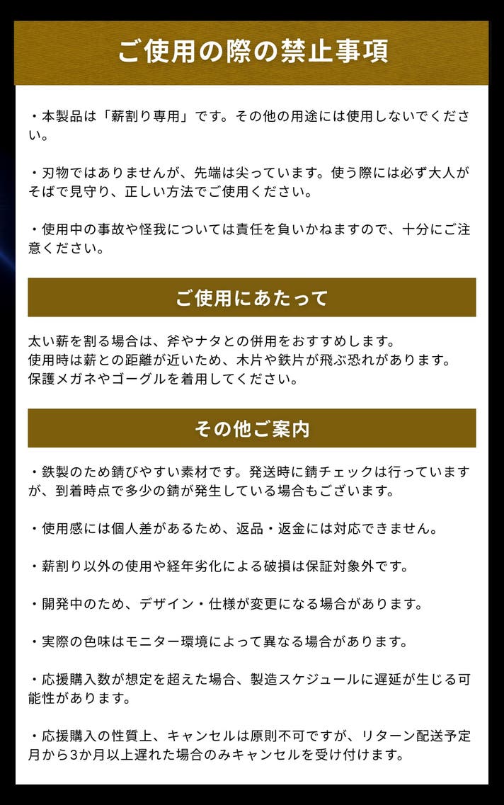 【配送遅延とキャンセルについて】 本文中に記載させていただいたスケジュールは、あくまでプロジェクト公開時点の予定です。応援購入の性質上、配送遅延のおそれがございます。原則として、配送遅延に伴う応援購入のキャンセルはできませんが、リターン配送予定月から3ヶ月 を超えた場合には、希望者に限りキャンセルにて対応させていただきます。 【商品等の不具合による返品・交換】 原則として、サポーター都合によるキャンセル・返金は承っておりません。 (サポーター都合のキャンセル不可の例:サイズが合わない、誤注文、長期不在) ◾️対応条件: 商品の初期不良、またはお届けした商品がご注文内容と異なる場合、到着後14日以内にプロジェクトページの「実行者にメッセージ」よりご連絡ください。状況を確認の上、返金対応、または良品との交換対応をさせていただきます。 ◾️返金額: リターン金額(税込)の全額 ◾️返品送料/再送料: 実行者負担 【返品・交換をお受けできない商品】 ・サポーターの責任により破損、汚損が生じた商品 ・商品のタグ、付属品、パッケージ(箱、袋など)を紛失、破棄された商品 ・事前にご連絡をいただいていない商品 ・商品到着後、15日以上経過した商品 【交換をお受けできないケース】 ・限定品や同一商品の在庫がない場合など、代替品をご用意できない商品 ≪禁止事項≫ ・薪割りの用途以外の危険な使用はしないでください。 ・先端部分を素手で触らないでください。 ・子供の手の届くところに置かないでください。 ・製品による怪我に関して弊社では一切の責任を負いかねます。充分気を付けてご使用ください。 ≪ご使用に際して≫ ・太い薪を割る場合は斧やナタなどと正しく使うことをお勧めします。 ・顔と薪の距離が近く、打撃した時の衝撃で鉄の欠片や木片が目に飛んでくる事があるため、危険回避の為に メガネやゴーグルの着用をお勧めします。 ≪その他≫ ・鉄製クサビは錆が発生しやすい素材です。ご到着時に錆が出ている場合 がございます。錆が出ていた場合は市販の錆取り剤などで落とすことができます。 また、使用後は錆びやすいので水分はふき取って収納してください。 ・使用感などに関しては、感じ方に個人差が予想される製品でございます。 そのため、使用感等に関する返品、返金はお受けいたしかねます。 ・通常の使用以外による破損(薪割り以外の使用による破損)や、長期使用での経年劣化につきましてはご対応できかねますのでご了承ください。 ・開発中の製品につきましては、デザイン・仕様が一部変更になる可能性もございます。 ・モニター、スマートフォンの環境により実際の商品の色と異なって見える場合がございます。 あらかじめご了承ください。 ・応援購入の数が想定より上回った場合、製造工程上の都合により出荷時期が遅れる場合がございます。 ・本プロジェクトを通して想定を上回るお客様から応援購入を頂き、現在進めている環境から量産体制を更に整える事が出来た場合、正規販売価格が販売価格より下回る可能性もございます。 応援購入サービスの性質上、以上の注意点につきましてあらかじめご理解とご了承いただいた上で応援購入くださいますようよろしくお願い申し上げます。