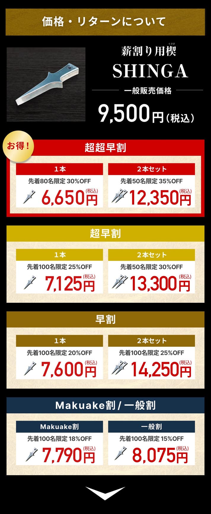 「Makuake(マクアケ)」は、実行者の想いを応援購入によって実現するアタラシイものやサービスのプラットフォームです。このページは、 プロダクトカテゴリの 「燕三条が鍛えた薪割りのクサビ 圧倒的な切れ味で薪割りの体験を変える!」プロジェクト詳細ページです。