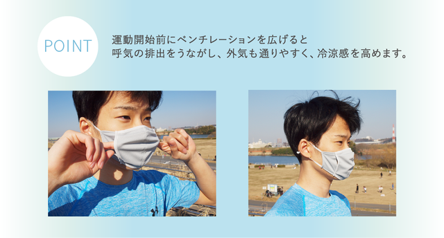 ランニング時はベンチレーション(通気口)を広げれば呼気の排出を促し、風の通りが良くなります。